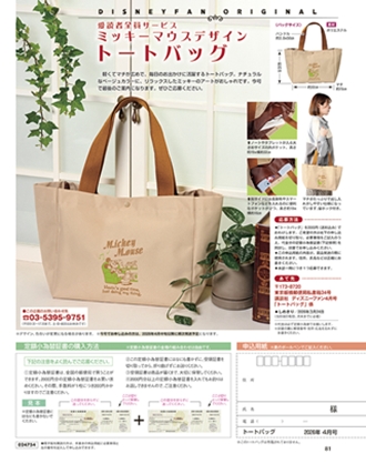 軽くてマチが広めで、毎日のお出かけに活躍するトートバッグ。ナチュラルなベージュカラーに、リラックスしたミッキーのアートがおしゃれです。今号で最後のご案内になります。ぜひご応募ください。